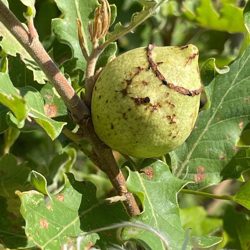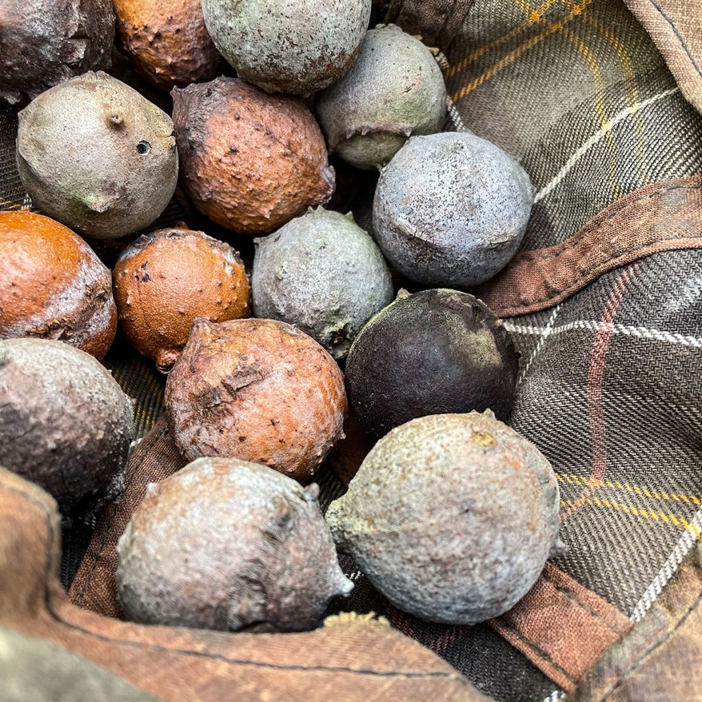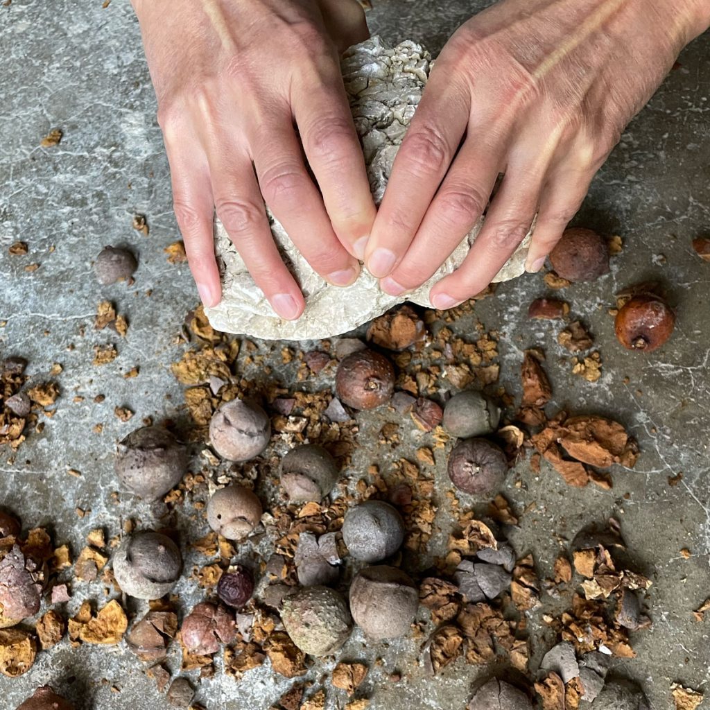 The oak galls (also called oak apples or oak nuts) used for this work were collected in the Molise region, Italy. In Europe the galls are created by the female Biorhiza Pallida, the oak gall wasp who lays single eggs in developing leaf buds of oak trees. The oak bud is infused by chemicals from the larvae’s secretion and changes slowly into a gall and forms a protective structure that host the metamorphosis of the larvae into adulthood.