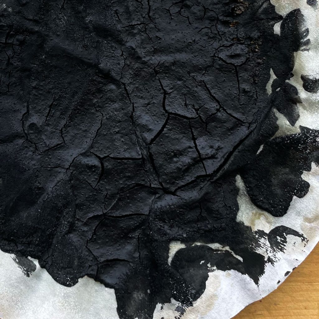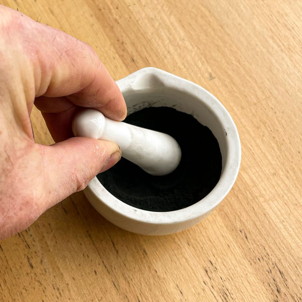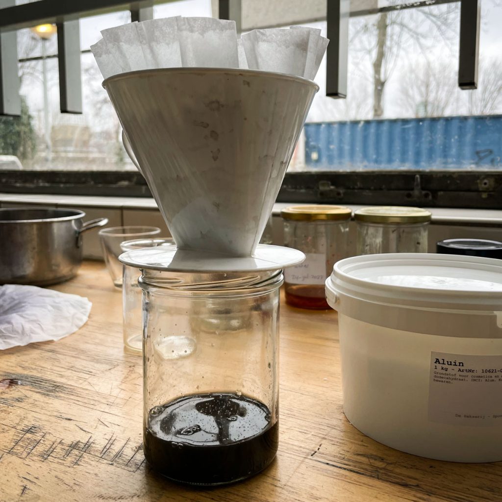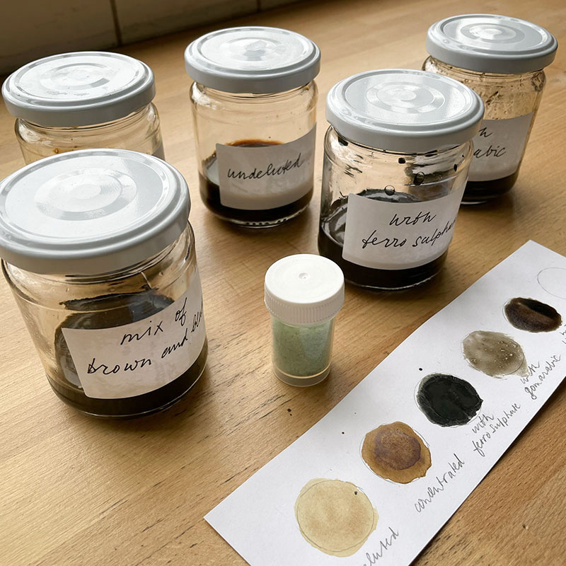 To make the ink, the galls are pulverised and subsequently, over a couple of days infused in rainwater. Gradually tannic acid is leached out of the oak galls while the water slowly turns into a brown liquid. Ferrous sulphate is added which will turn the ink black. When exposed to air it will get even darker and become pitch black. Adding gum arabic will create a treaclier substance which makes it more suitable for writing, drawing and printing. Experimentation also includes extracting pigment from the ink before mixing it with gum arabic