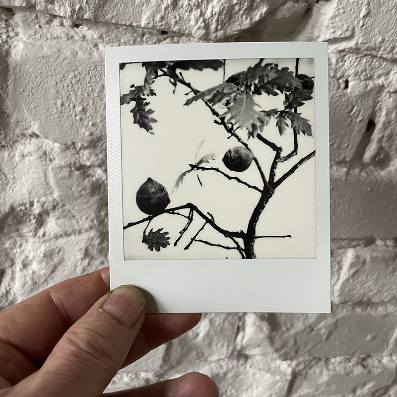 Ink made from oak galls (also called oak apples or oak nuts) was used for making a silkscreen print that became part of a three dimensional collage juxtaposing various components that refer to the ink making process. The Polaroid of galls on an oak tree branch that was used for the print is part of my The Museum Within Me: Black & White Polaroids project.