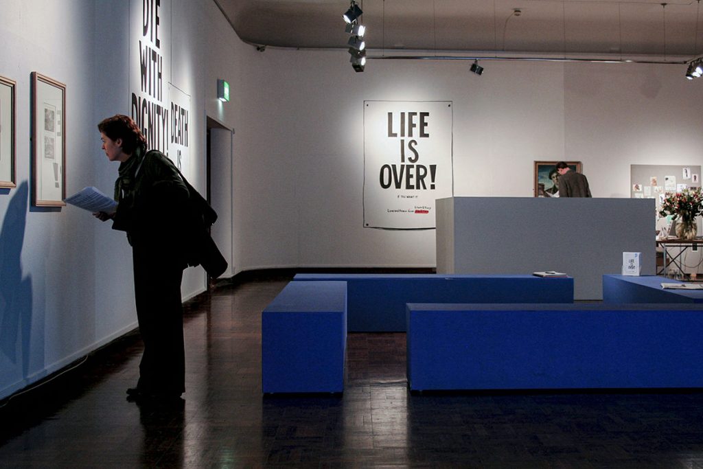 A public events programme located within the gallery included a multidisciplinary symposium ‘What role can art play in mediating issues around life and death?’; a seminar focusing on the relationship between place, architecture and suicide; a lecture ‘Contemporary art practice as a site for production, social engagement and reflection’; in-conversation gallery discussion between the artists and UK public collections organisations ‘Artists’ perspectives on mortality: life and death’; a PhD-led Master of Fine Art students’ collaborative performative response to Life is Over! if you want it, ‘Exquisite Corpse; a Contemporary Unfolding’.