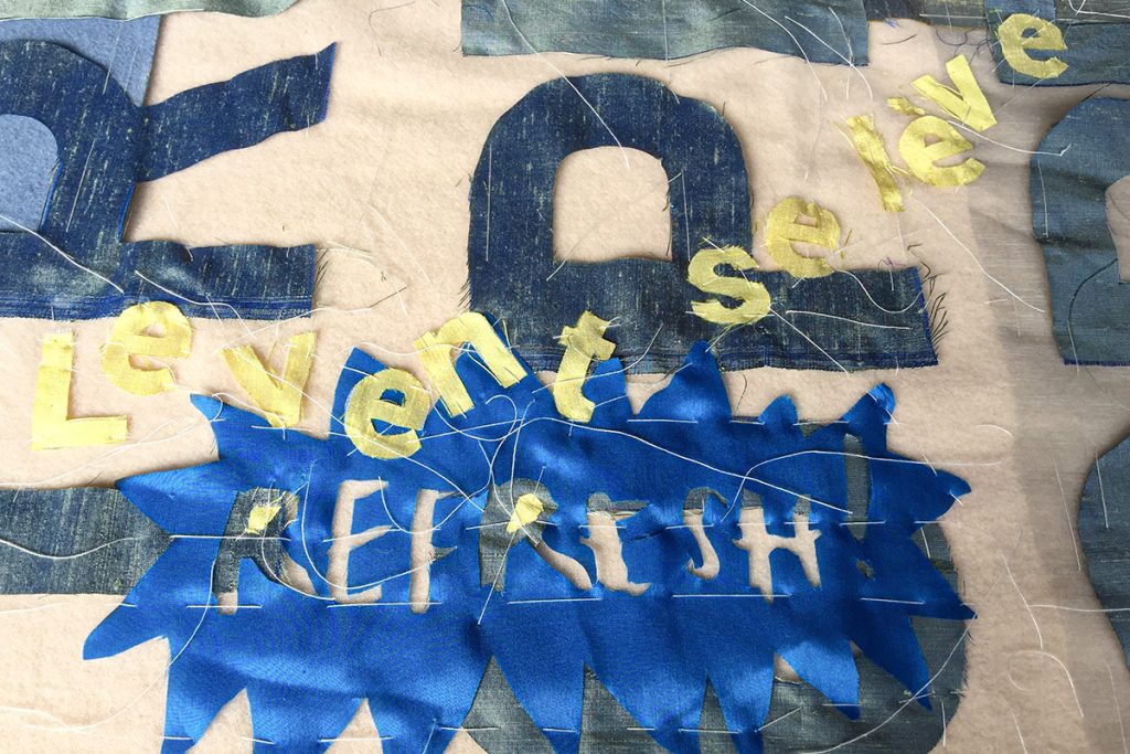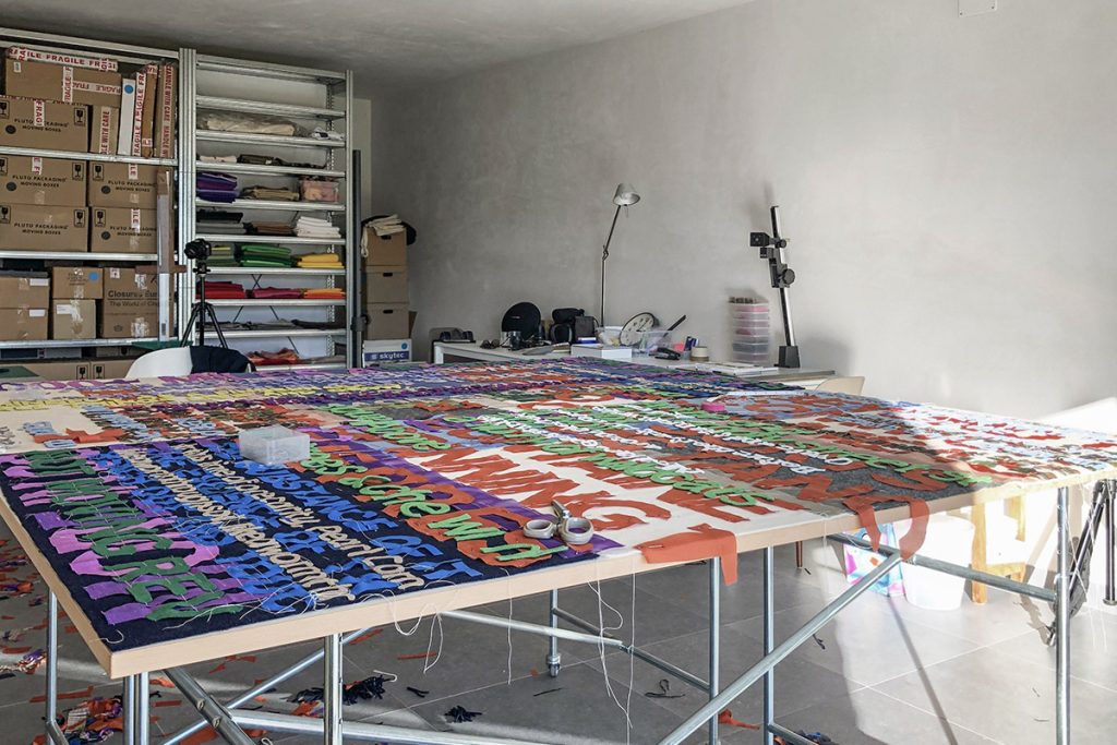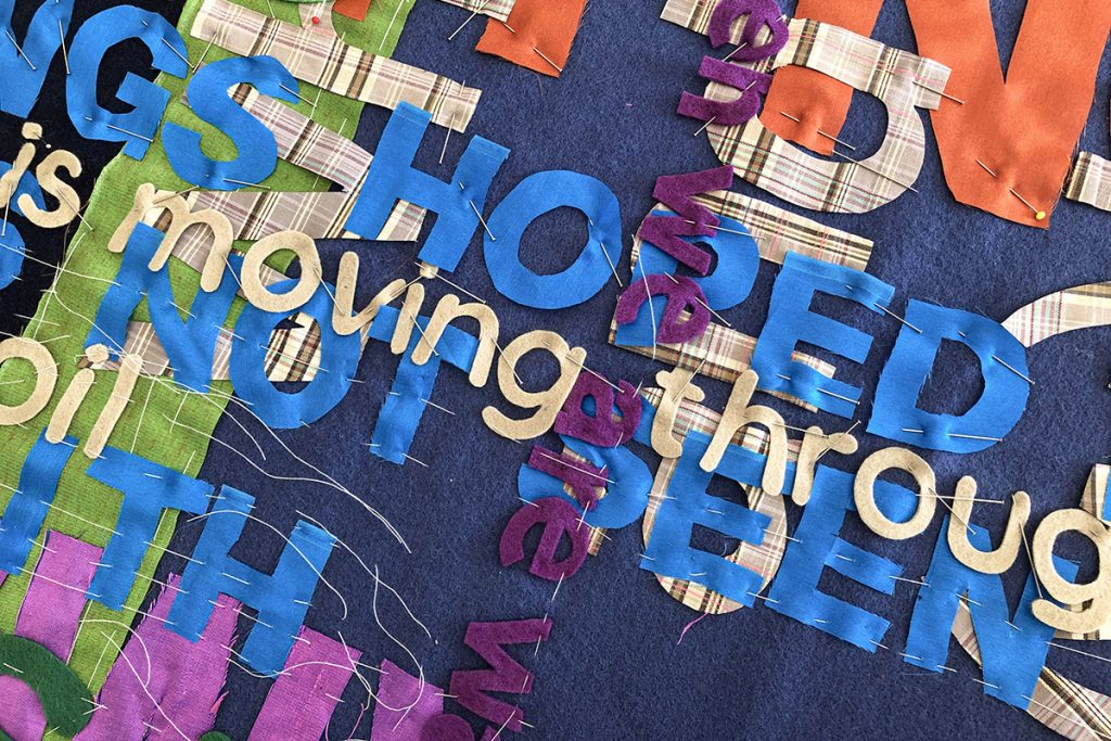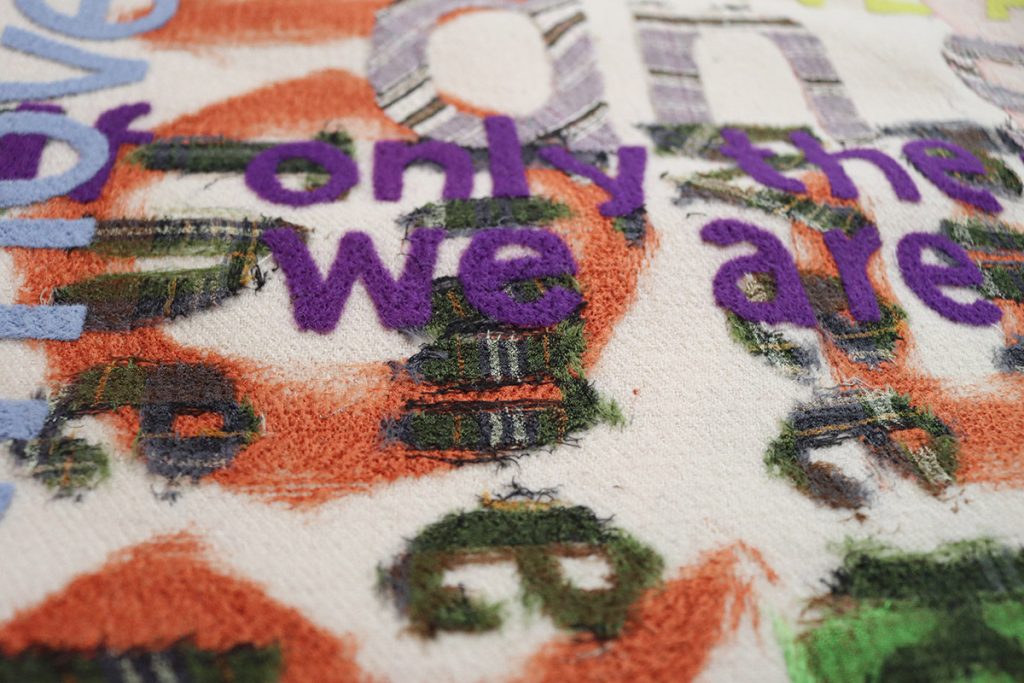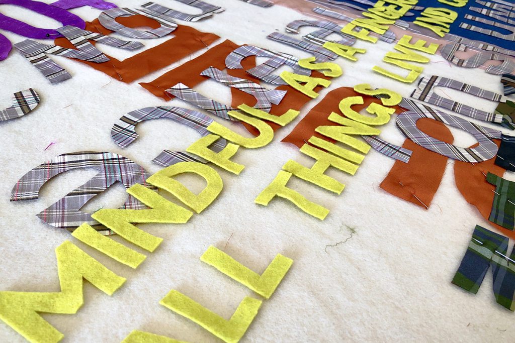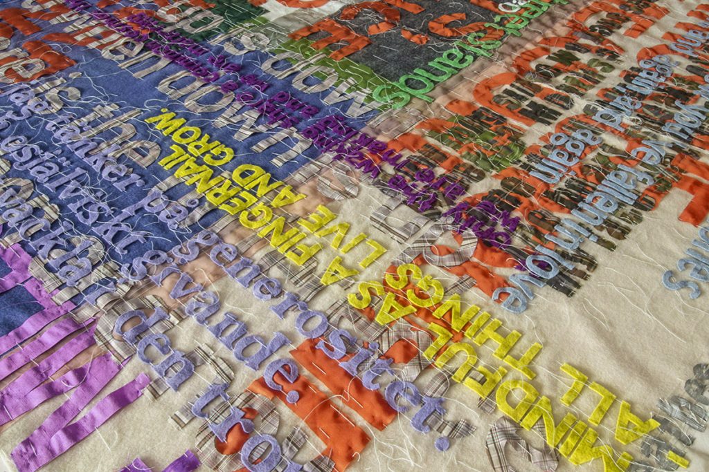 The hand-cutting of the texts in fabric, and tacking these to the surface of each blanket is a slow, laborious, thought-provoking process. Deceleration is enriching, and produces profound moments of exchange between Tracy & Edwin, triggered by the content gifted from their far-flung friends. The combined excerpts come to represent a range of voices, creating a ‘portrait’ of the impact of Covid-19.