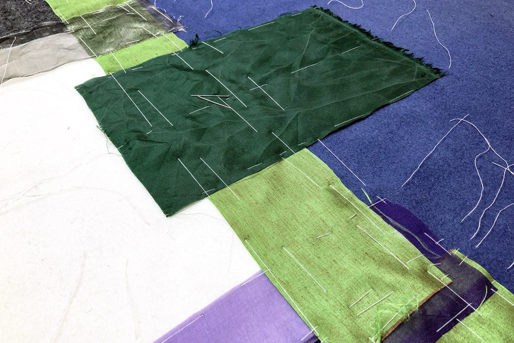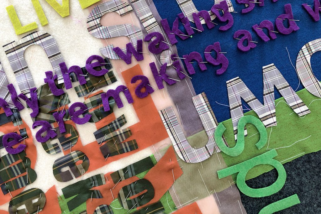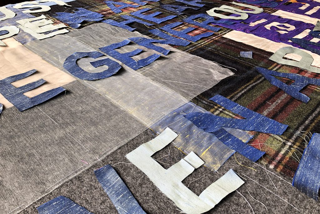 Each blanket has the same underlying focus: hand-made on site, extracts of conversations (face-to-face and online) are cut as fabric letters and applied to the woollen surface, slowly revealing ideas and opinions about e.g. belonging, attachment and memory in Tokyo; how a ‘soft city’ might be understood by its inhabitants as the fluid and impressionistic spaces between architectural exteriors in Birmingham; the state of Scottish identity at the time of the opening of the Scottish Parliament.