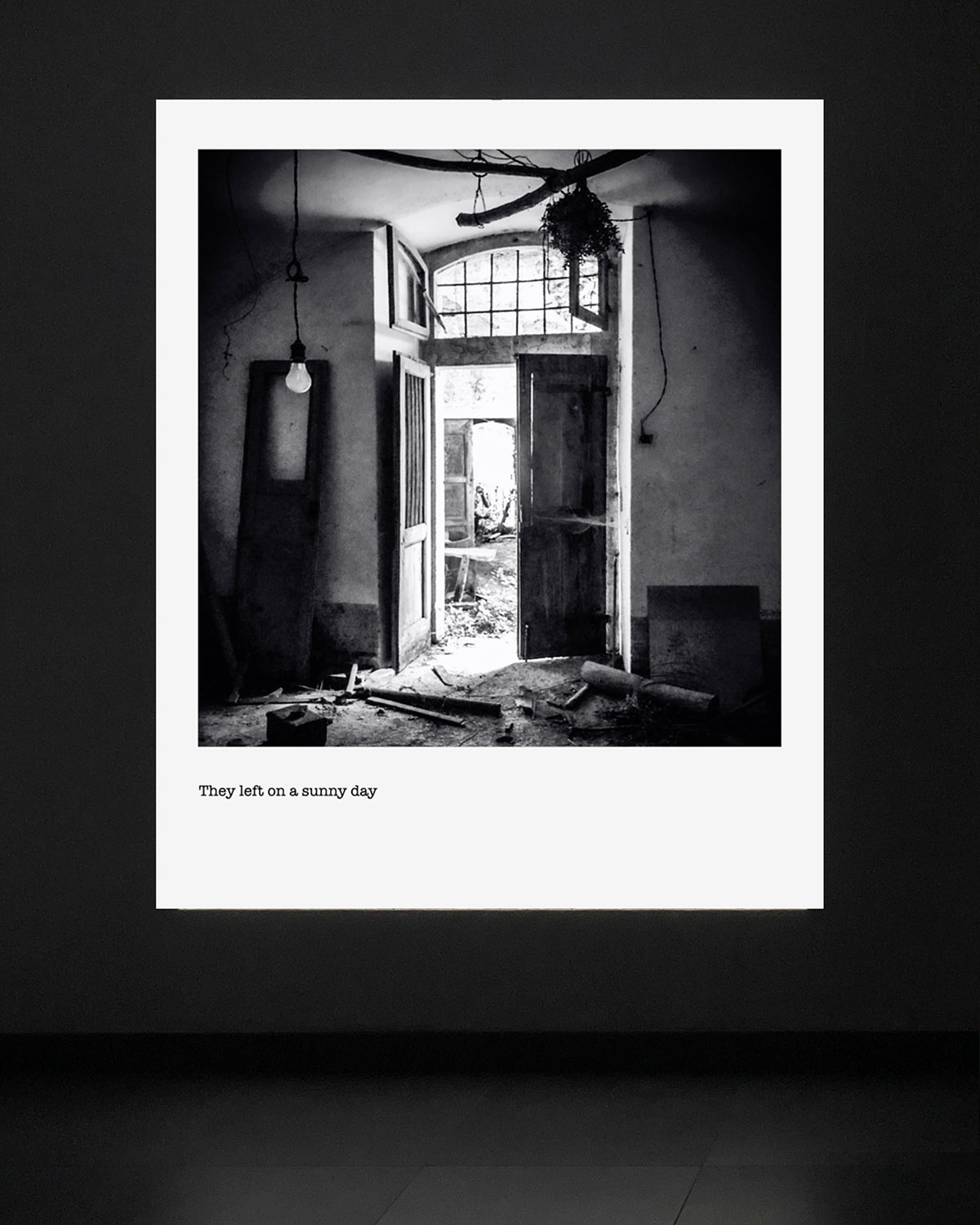 They Left on a sunny day (09:06) is a video work presented as a still image projection that depicts an abandoned house reflecting on its own demise after the departure of its former inhabitants.
